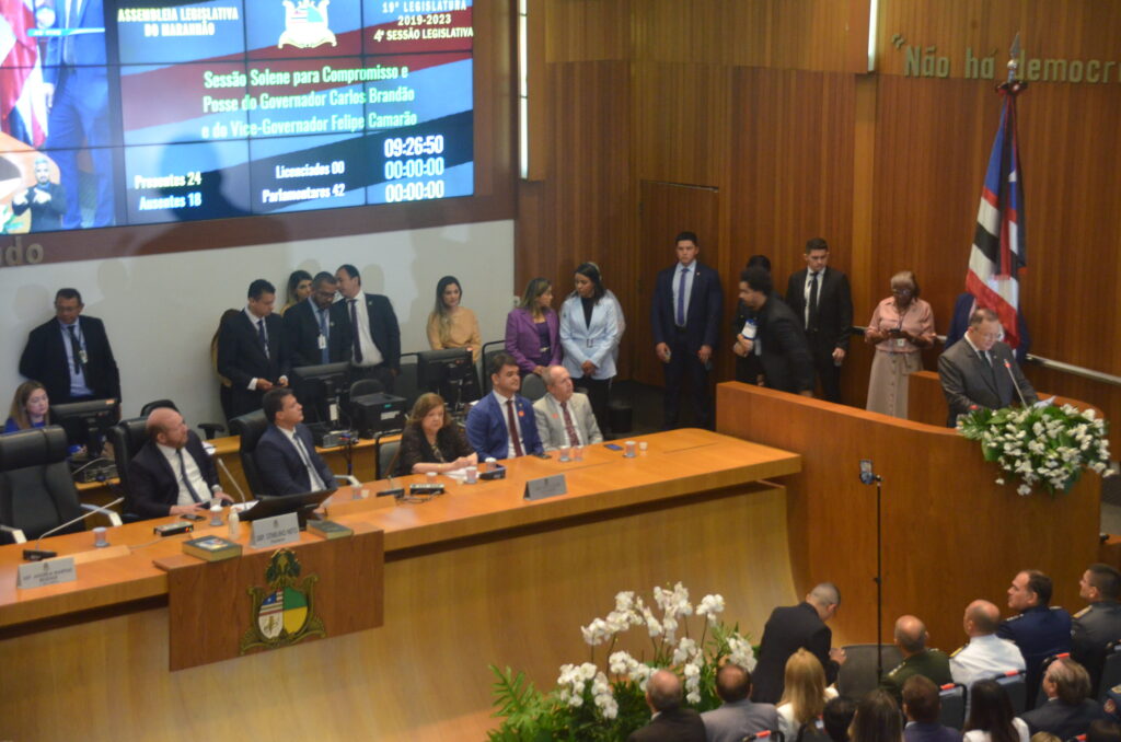 Após assinar fazer o juramento e assinar o termo de posse, Carlos Brandão discursou para uma plateia formada por autoridades civis e militares, deputados, familiares dos empossados, imprensa e convidados. Brandão afirmou que o momento é de esperança para o estado por conta das muitas parcerias que irão fortalecer o governo.