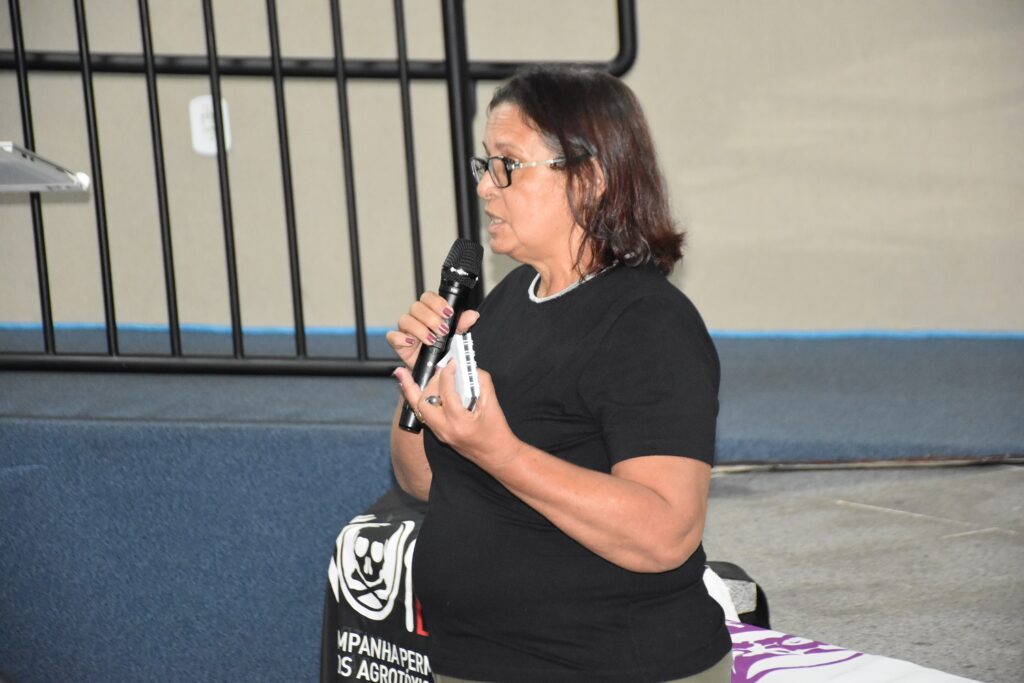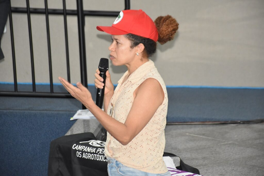 A filha de camponeses Kátia Gomes de Sousa, do assentamento Califórnia, em Açailândia, narrou as consequências negativas dos defensivos agrícolas. “Somos impactados até hoje pelos agrotóxicos. A gente mora em um espaço cercado pela monocultura do eucalipto e sofremos com a pulverização dos agrotóxicos, contaminação do solo, da água, das pessoas. Hoje temos casos de pessoas em nosso assentamento que estão morrendo de câncer”.